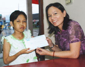 Đại diện Báo Cần Thơ trao số tiền 160.000 đồng của bạn đọc gởi ủng hộ chị Lê Thị Út Nhỏ, ngụ phường Lê Bình, quận Cái Răng. Ảnh: X.ĐÀO |
