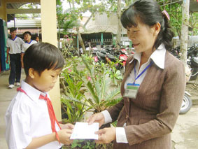 Đại diện Trường THCS Hưng Phú (bên phải) trao tiền của bạn đọc Báo Cần Thơ gởi giúp em La Việt Tiến. Ảnh: K.C. |