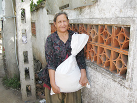 Mẹ em Trương Quang Trung vui mừng nhận gạo của bạn đọc Báo Cần Thơ gởi tặng. Ảnh: K.C. |