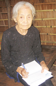 Bà Nguyễn Thị A ký tên nhận tiền bạn đọc gửi tặng. Ảnh: T.H.