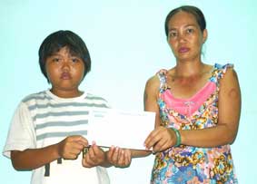 Hồng Thủy và mẹ nhận tiền bạn đọc gởi tặng. Ảnh: N.D.