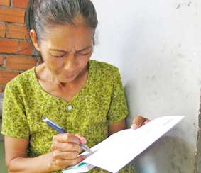 Bà Cúc ký tên nhận tiền của nhà hảo tâm gởi giúp đỡ. Ảnh: Đ.L.