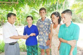 Cán bộ xóa đói giảm nghèo xã Trường Thành, huyện Thới Lai trao tiền của bạn đọc Báo Cần Thơ gởi ủng hộ bà Nguyễn Kim Anh, ở ấp Trường Trung.