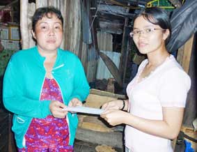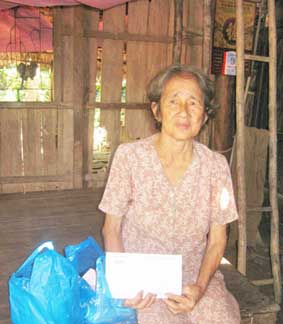 Bà Phạm Thị Bảy (bên trái ảnh), nhận tiền của bạn đọc gởi giúp đỡ. |