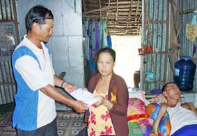 Ông Võ Hồng Hương, Trưởng ấp Thới Hòa, thị trấn Cờ Đỏ, huyện Cờ Đỏ, TP Cần Thơ (bên trái ảnh), trao tiền cho bà Phó Thị Lòl (vợ ông Trịnh Tái Hoàng). |