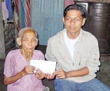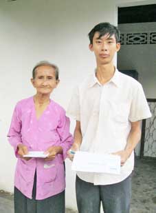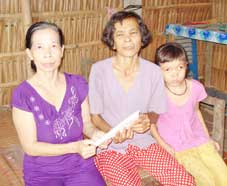 Bà Phó Thị Lòl, vợ ông Trịnh Tái Hoàng (bên trái ảnh), nhận tiền của bạn đọc gởi giúp đỡ. |