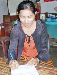 Chị Lâm Thị Trúc xúc động ký nhận tiền bạn đọc gởi tặng. |