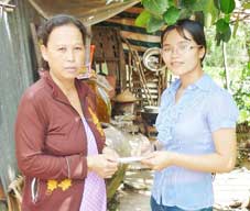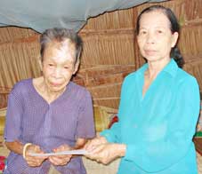 Chị Lê Thị Hoa, Chi hội phó Chi hội Phụ nữ khu vực Thạnh Lợi (bên trái ảnh) trao tiền bạn đọc gởi tặng cho chị Lê Thị Tư. |