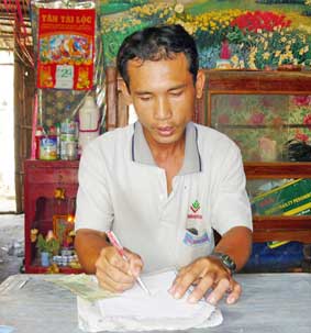 Anh Nguyễn Trường Vũ, cha ruột bé Yến Phương, ký nhận tiền của bạn đọc gởi tặng.