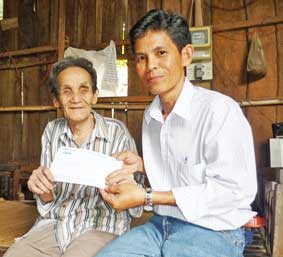 Ông Lê Bá Toàn (ngồi bên phải), Trưởng ấp Mỹ Nhơn, xã Mỹ Khánh, huyện Phong Điền trao tiền của bạn đọc gửi giúp ông Võ Văn Răng.