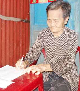 Bà Tư Sạch ký nhận tiền bạn đọc gởi tặng.