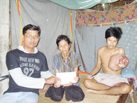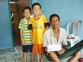 Anh Lê Văn Phụng và 2 con nhận số tiền bạn đọc gởi giúp đỡ. |