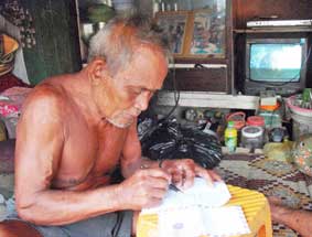 Cụ Danh Kiệu, ký nhận tiền bạn đọc Báo Cần Thơ gởi tặng. Ảnh: L. SEN. |