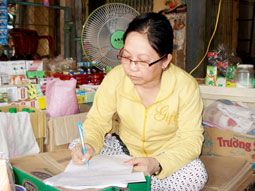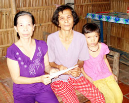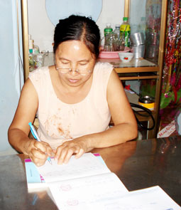 Mẹ của chị Kim Thoa ký nhận tiền bạn đọc gởi tặng.