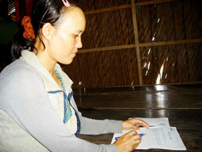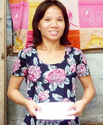 Chị Thanh (chị gái của Xuân Mai) ký giấy nhận tiền bạn đọc tặng. Ảnh: T.Trang |