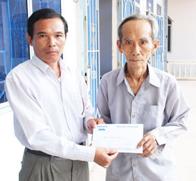 Ông Lê Văn Tổng, Chủ tịch UBND xã Trường Long, huyện Phong Điền, trao tiền của bạn đọc Báo Cần Thơ gởi ủng hộ ông Huỳnh Ngọc Điệp, ở ấp Trường Phú B. Ảnh: X.Đ