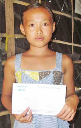 Em Huỳnh Thúy Mỹ nhận tiền do bạn đọc gởi tặng. Ảnh: NG.B.