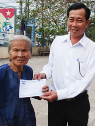 Lãnh đạo UBND xã Trường Long, huyện Phong Điền trao tiền của bạn đọc Báo Cần Thơ gởi ủng hộ bà Huỳnh Thị Ký. Ảnh: X.ĐÀO.