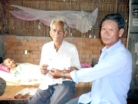 Ông Nguyễn Văn Châu (ngồi bìa phải), Trưởng ấp Trường Tây A, trao tiền của bạn đọc cho gia đình bà Bùi Thị Hương.
