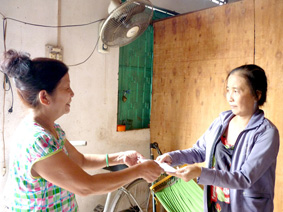 Bà Đặng Thị Tòng, Tổ trưởng Tổ phụ nữ tổ 60, khu vực 3, phường Hưng Lợi (bên trái ảnh) trao tiền cho bà Nguyễn Thị Lan Phương.
