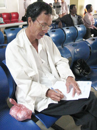 Ông Ngoan ký tên nhận tiền của nhà hảo tâm gởi tặng.