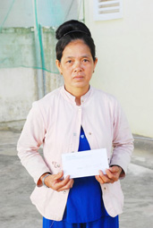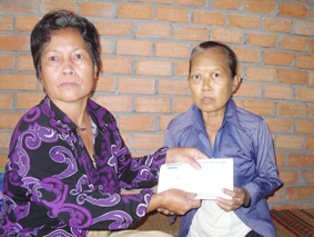 Bà Năm Bảnh, thay mặt bà Huệ nhận tiền của bạn đọc gởi cho gia đình bà Huệ. Ảnh: LÝ THEN. |