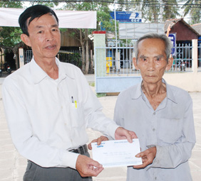 Đồng chí Đỗ Văn Chung, Phó Chủ tịch UBND xã Trường Long trao tiền của bạn đọc Báo Cần Thơ gởi giúp hai bà cụ: Huỳnh Thị Nhựt và Huỳnh Thị Ký. Ảnh: X.ĐÀO. |