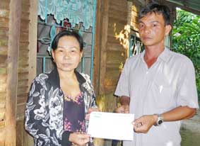 Ông Nguyễn Thanh Dũng, Trưởng ấp Mỹ Thuận, xã Mỹ Khánh, trao tiền của bạn đọc Báo Cần Thơ cho mẹ của chị Bích Tuyền. Ảnh: LÊ NGỌC |