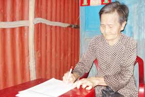 Bà Tư Sạch ký nhận tiền bạn đọc gởi tặng.