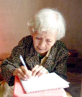 Bà Hồ Trường Kim Chi ký nhận tiền của bạn đọc gởi ủng hộ.