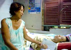Hai mẹ con anh Lưu Quang Linh nhận tiền của bạn đọc gởi giúp đỡ.