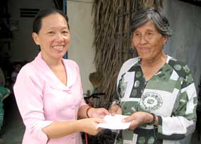 Đại diện Hội Chữ thập đỏ khu vực 6 phường Hưng Lợi (bìa trái) trao tiền của bạn đọc Báo Cần Thơ gởi giúp bà Nguyễn Thị Xem. Ảnh KC