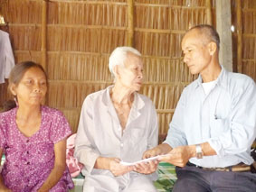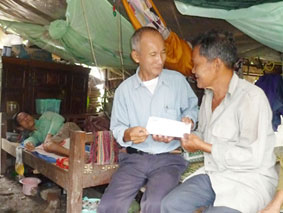 Ông Ngô Văn Hùng, Chủ tịch Hội CTĐ xã Tân Thới trao tiền của bạn đọc cho ông Nguyễn Văn Đực (bìa phải). Ảnh: LÊ NGỌC. |