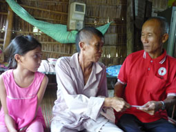 Ông Ngô Văn Hùng, Chủ tịch Hội Chữ thập đỏ xã Tân Thới trao tiền của tập thể cán bộ Khoa Chẩn đoán hình ảnh siêu âm Bệnh viện Đa khoa Trung ương Cần Thơ cho chú Nguyễn Văn Tia. Ảnh: LÊ NGỌC |