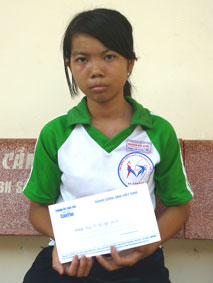 Mỹ Duyên nhận tiền bạn đọc Báo Cần Thơ gởi tặng. Ảnh: N.D |
