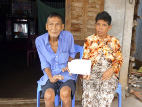 Vợ chồng ông Sang Văn Hai và bà Thạch Thị Phê nhận tiền giúp đỡ của bạn đọc. |
