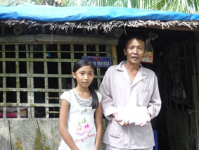 Chú Nguyễn Văn Tia và con gái nhận tiền bạn đọc gởi tặng. Ảnh: LÊ NGỌC |
