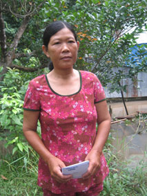 Bà Sáu xúc động nhận tiền bạn đọc gởi tặng. |