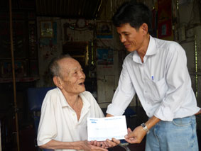 Ông Lê Bá Toàn, Trưởng ấp Mỹ Nhơn, trao tiền của bạn đọc cho bác Lê Văn Sanh. Ảnh: LÊ NGỌC |