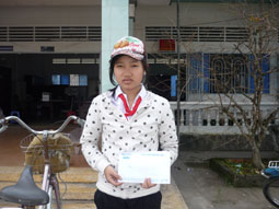 Tại UBND xã Nhơn Nghĩa, em Lê Nguyệt Thu thay mặt gia đình gởi lời cảm ơn đến bạn đọc đã quan tâm, giúp đỡ. Ảnh: LÊ NGỌC |