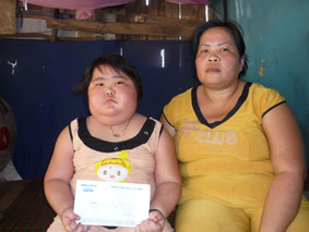 Bé Võ Ngọc Hân cùng mẹ nhận tiền bạn đọc gởi tặng. Ảnh: LÊ NGỌC |