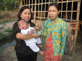 Cô Bảy (trái) thăm hỏi và trao tiền của Cô Châu tặng gia đình cháu Hiếu.