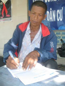 Anh Phụng ký tên nhận tiền của nhà hảo tâm |