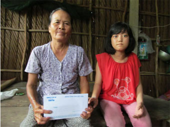 Bà Nguyễn Thị Hường, vợ ông Nguyễn Văn Được nhận tiền do nhà hảo tâm gởi tặng. Ảnh: NG.B