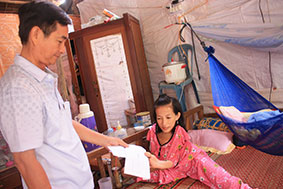 Ông Lý Văn Út, Chủ tịch Ủy ban MTTQVN xã Thủy Liễu trao tiền bạn đọc Báo Cần Thơ gởi giúp cho mẹ con Hồng Nhung.