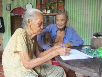 Vợ chồng ông Nguyễn Văn Được nhận tiền do nhà hảo tâm gởi tặng. Ảnh: NG.B