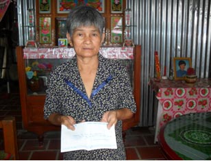 Bà Mai Thị Quẳn (cô ruột của mẹ Dình) đại diện nhận tiền từ thiện của bạn đọc gởi tặng.