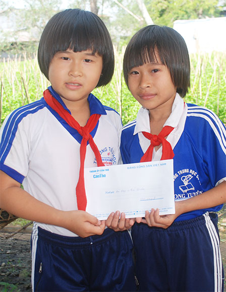 (CT) - Ngày 28-11-2013, phóng viên Báo Cần Thơ đã đến trao 500.000 đồng của bà Phạm Thị Thanh Giang, Trường Trung cấp Cảnh sát nhân dân III cho 2 cháu Nguyễn Ngọc Đẹp và Nguyễn Bích Trâm, ở khu vực Bình Phó A, phường Long Tuyền, quận Bình Thủy (TP Cần Thơ), là trẻ mồ côi nghèo, hiếu học. Cha mẹ của hai cháu bị bệnh qua đời ở tuổi còn rất trẻ. Hiện hai cháu được ông, bà ngoại già yếu, không nghề nghiệp cưu mang, nuôi dưỡng, cuộc sống gia đình rất khó khăn.