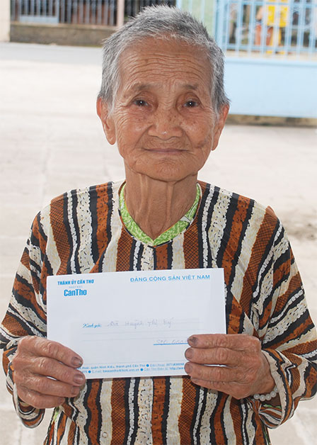 Bà Huỳnh Thị Nhựt rất vui khi nhận được tiền của bà Phạm Thị Kim Chi, ở quận Tân Phú, TP Hồ Chí Minh gởi giúp đỡ cụ. Ảnh: X.Đào