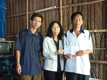 2 người bạn đại diện cho bạn đọc Nguyễn Thị Kim Hạnh, Prulaza, quận 8, TP Hồ Chí Minh trao tiền cho em Lê Văn Đề.